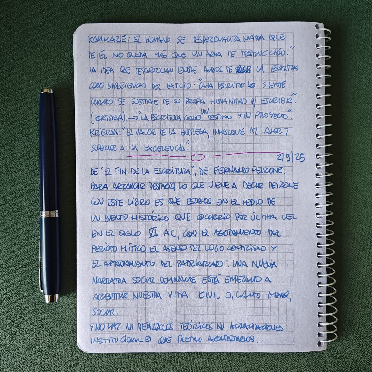 Esa renovada pasión es fruto de un proceso largo, pero con mojones claros, evidentes, entre los que se destacan Aira, Alberto Giordano, Silvio Mattoni y la ya mencionada Luciana Martínez. El fin de la escritura, de Fernando Peirone, viene a integrar esa lista que revitaliza mi entusiasmo por compartir todo lo que hay en la escritura y solemos dar por sentado, todo lo que, históricamente, está contenido en la palabra escrita como herramienta de creación, y todo el pasado humano con el que podemos conectar, si somos medianamente conscientes de él, cuando escribimos.