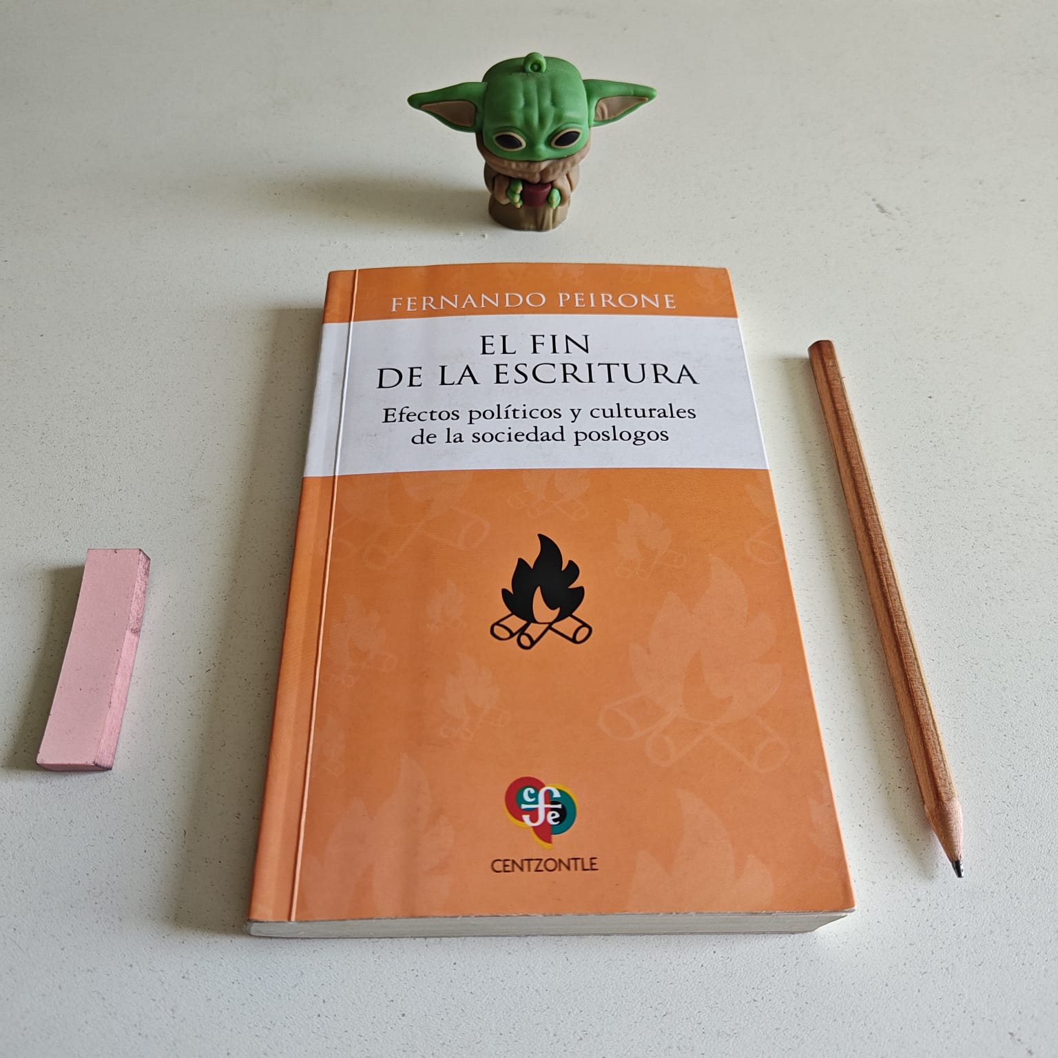 El fin de la escritura, de Fernando Peirone, es un libro pequeño pero de una potencia enorme. Uno de esos libros (como La doble rendija: Autofiguraciones científicas de la literatura en el Rio de la Plata, de Luciana Martínez) que me producen un gran impacto. Me conmueve la habilidad de condensar un vastísimo corpus de saberes y conocimientos en un texto legible para un lector no universitario como yo.